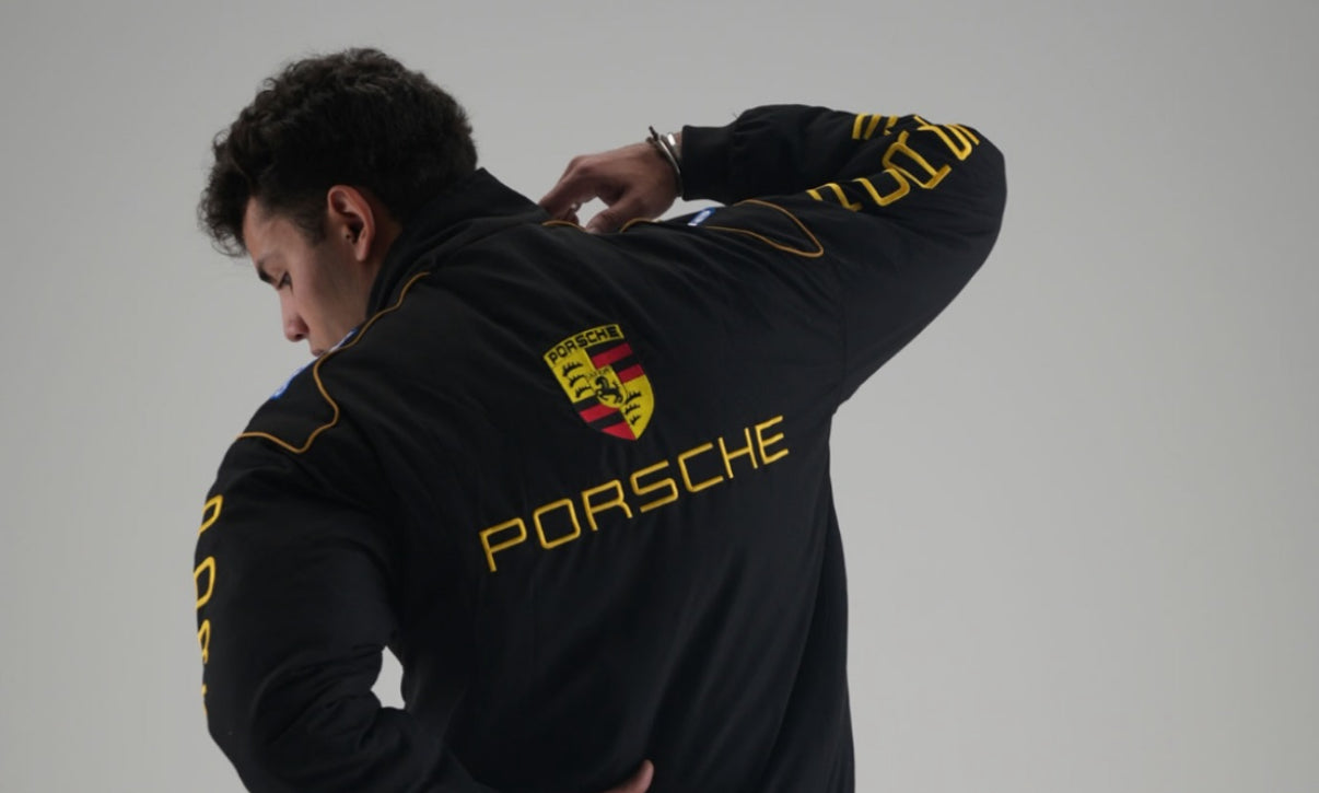 Porsche Racing Team Jacket – Black Motorsport Zip-Up with Yellow Embroidered Logos