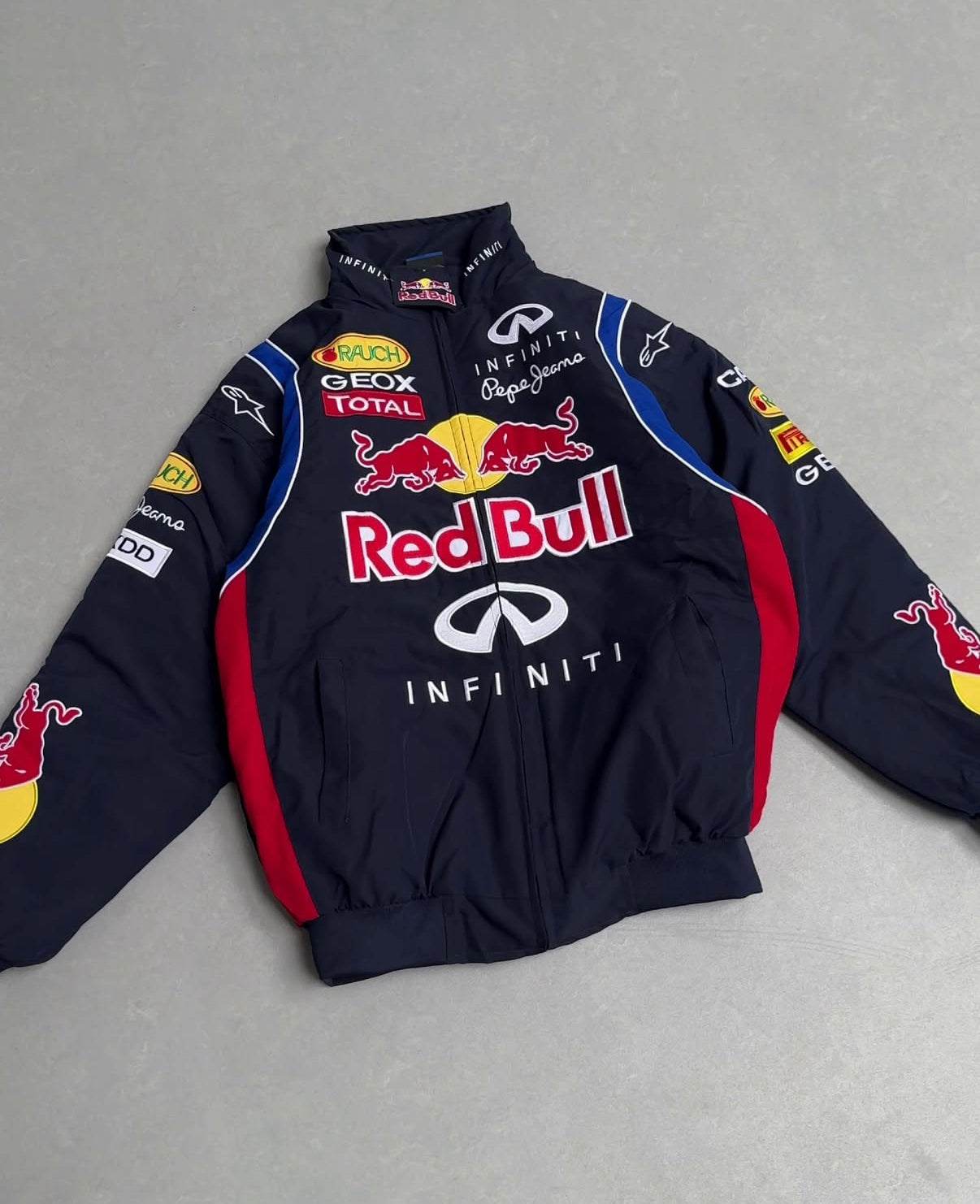 Red Bull Racing F1 Team Jacket - Navy Blue Motorsport Bomber with Embroidered Sponsors